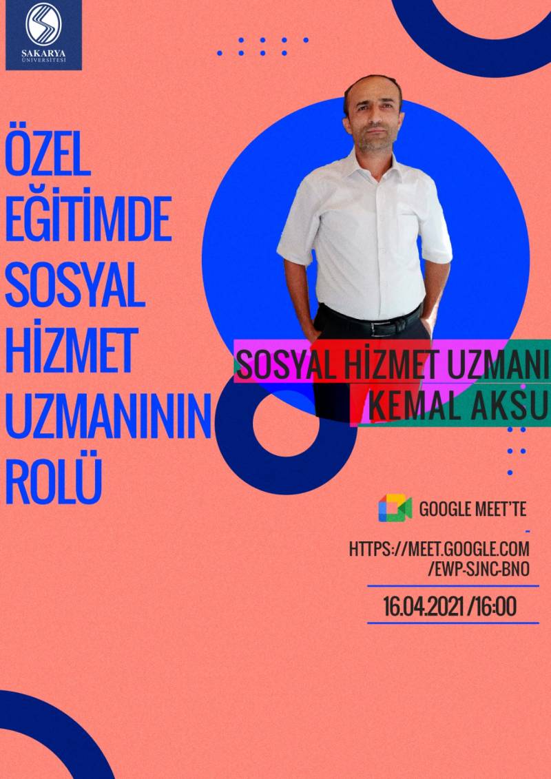 16.04.2021 tarihinde, saat 16.00'da gerçekleştirilecek "Özel Eğitimde Sosyal Hizmet Uzmanının Rolü" başlıklı webinar linkine Özel Eğitim Öğrenci Topluluğu instagram hesabından ulaşabilirsiniz.
