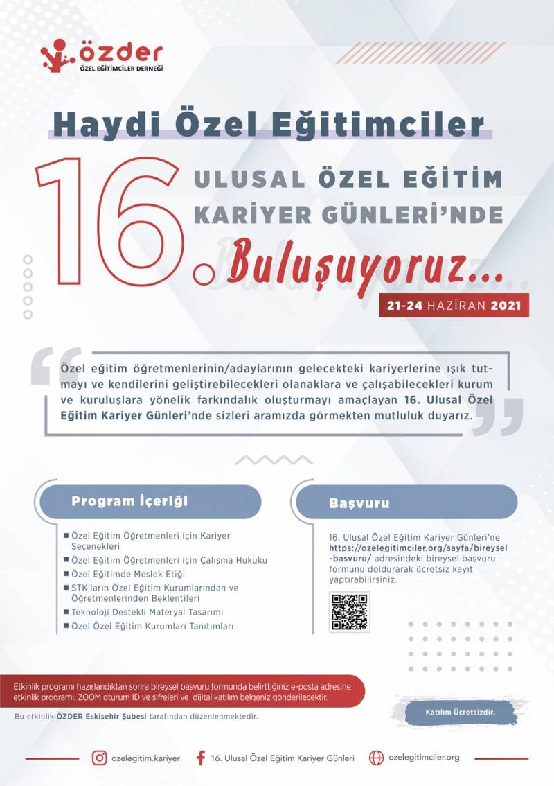 ÖZDER tarafından düzenlenen 16. Ulusal Özel Eğitim Kariyer Günleri'nde özel eğitim öğretmenleri ve öğretmen adayları ile özel özel eğitim kurumları buluşacaktır. Aynı zamanda kariyer günleri kapsamında özel eğitim öğretmen ve öğretmen adaylarının mesleki gelişimine katkı sunacak seminerler düzenlenecektir.