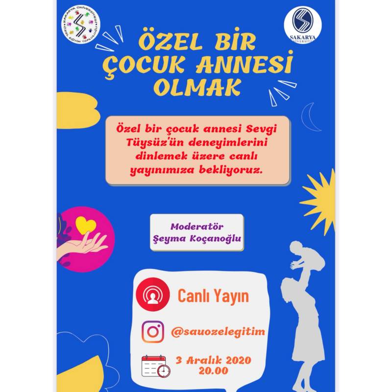 03.12.2020 Perşembe günü, saat 20.00'de otizmli bir çocuk annesi Sevgi TÜYSÜZ ile “Özel Bir Çocuk Annesi Olmak” başlıklı bir söyleşi gerçekleştirilecektir. Söyleşiye Sakarya Üniversitesi Özel Eğitim Öğrenci Topluluğu'nun instagram hesabından katılabilirsiniz.